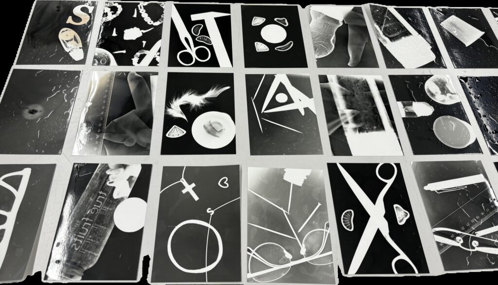Die Fotogramme wurden heuer in der Dunkelkammer hergestellt. Dabei haben wir ohne Kamera gearbeitet und stattdessen verschiedene Objekte direkt auf lichtempfindliches Papier gelegt. Durch gezielte Belichtung entstanden so einzigartige, unmittelbare Bildspuren der verwendeten Materialien.